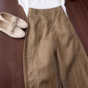 今年人気の女性用レイジースタイルハイウエストワイドレッグパンツ夏ブラウンテンセルリネンゆったり快適カジュアルパンツ