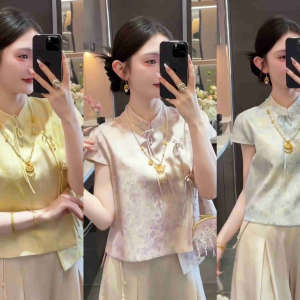 新しい中国風の女性のナチュラルフラワー半袖シャツ夏のライト高級ハイエンドサテン中国風チャイナトップトレンディ