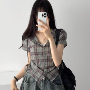 韓国シックなサイド巾着レトロチェック柄フード付き半袖シャツ女性用