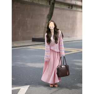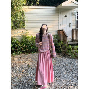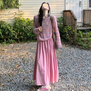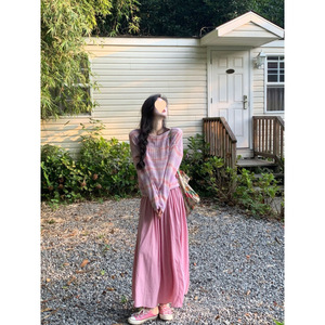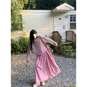 甜美风套装女春秋新款条纹撞色针织衫毛衣高腰半身裙两件套高级感