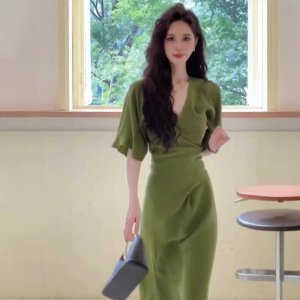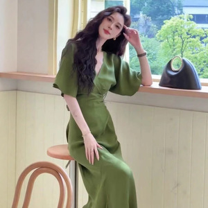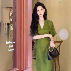 syfs9131 フレンチエレガントなグリーンドレス女性のための 2025 夏の新しいファッション V ネックスリムロングスカート