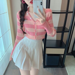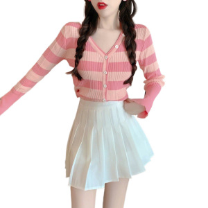 学院风学生减龄套装女春秋新款领条纹针织上衣+高腰百褶裙两件套