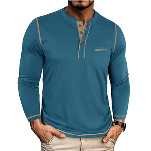 ヨーロッパとアメリカのラウンドネック紳士服秋と冬のタフガイレトロヘンリーポケットTシャツ長袖外国貿易メンズボトムスコントラストカラー老人シャツ
