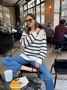 2025年欧米風レトロストライプ麻編みセーター、ボタン飾り、ツイストロープ編み、ゆったりデザイン、プルオーバーニット