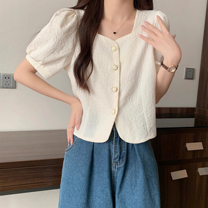 スクエアカラーパフ半袖シックな2025夏の新しいルーズで多用途なシャツレディースTシャツショートトップ