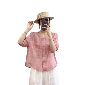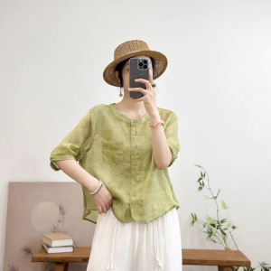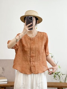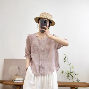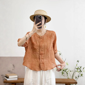 ラミー半袖シャツ 2025 夏新文学レトロルーズラウンドネックバーニッシュカーディガントップ 1020