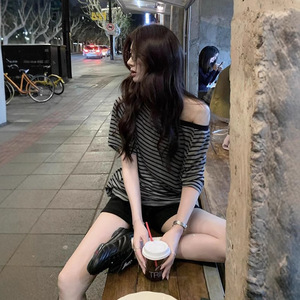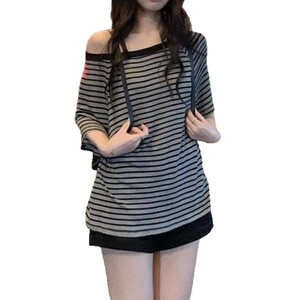 韓国版の新しいゆったりとしたレイジーストライプの斜め肩半袖Tシャツ、夏の女性用、肉感をカバーし、スリムに見せる、オフショルダーのリラックストップ