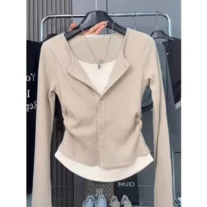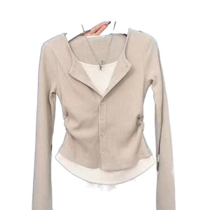 コントラストカラーステッチフェイクツーピースシングルブレスト長袖シャツ女性用2025秋プリーツウエスト痩身ボトムストップ