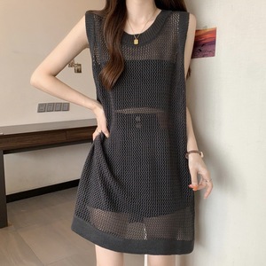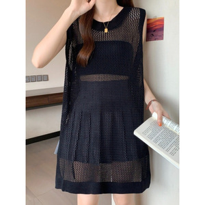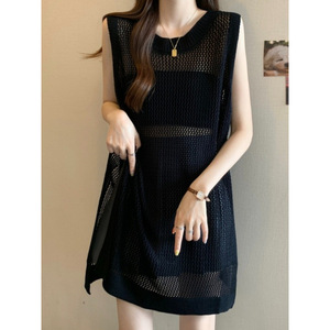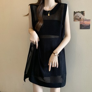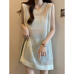 ラウンドネックミドル丈中空ニットベストブラウス女性用夏大きいサイズゆったり韓国風優しく万能な着痩せトップス
