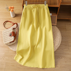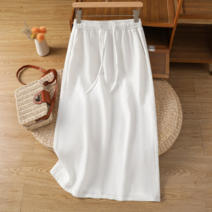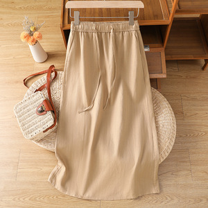 ネイビーブルーテンセルリネンスカートレディース夏薄手2025新作ミドル丈コットンリネンAラインスカートスリットストレートスカート