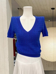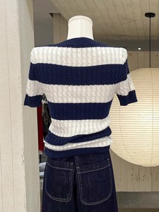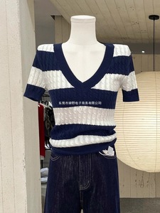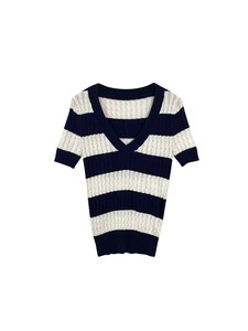 6937 # Thirteen Lines 2025 夏韓国スタイルの優しいスタイル V ネックプルオーバー半袖ツイストストライプコントラストカラーセーター