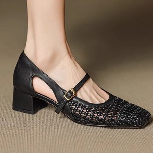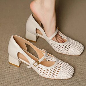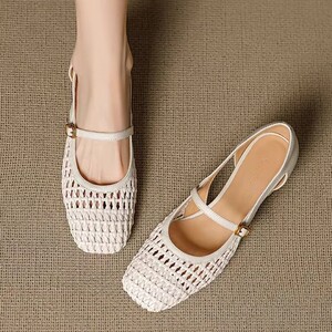 春夏の女性用の履きやすいフレンチシューズ、中空織りスクエアトゥ、ミディアムヒール、太いヒール、女性用本革オフホワイトサンダル