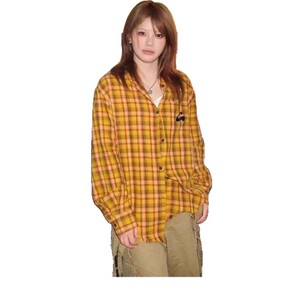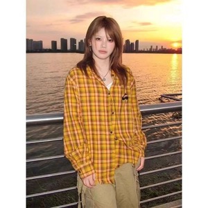 シャツレディース長袖アメリカンドーパミンイエローチェック柄シャツ裾ローエッジカーディガントップラペルジャケット女性用