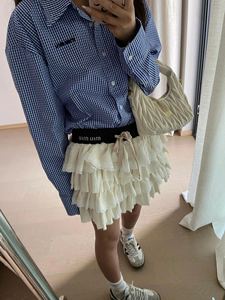 ミウ家グレー系文字刺繍知性系重ね着チェック柄シャツバレエガールパフスカートセット