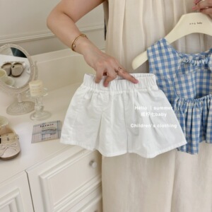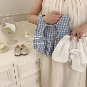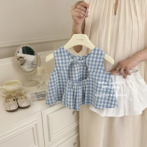 [Xian Ning Qi] 女の子の背中の開いたベビードールトップ韓国子供の夏の新鮮で甘いチェック柄ベストショーツ