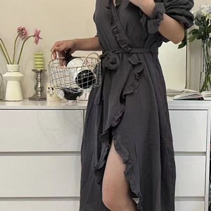 ナイトガウンライト高級春秋韓国風シンプルルーズフリル長袖ミドル丈バスローブホームウェアパジャマ新スタイル