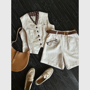 深セン南友の超人気夏服、エレガントで控えめな小さな香りのオリジナルカラーリネンベストとショートパンツスーツの完全なセット