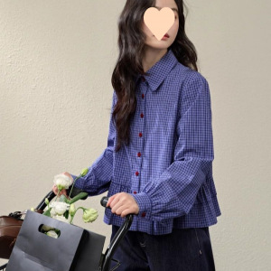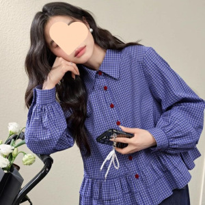 大きいサイズのブルーチェック柄シャツ女性のための 2025 春の新しいスタイルのフリル長袖シャツトップショート秋