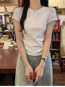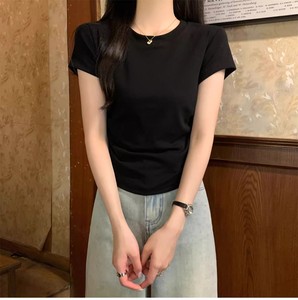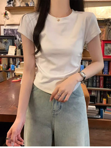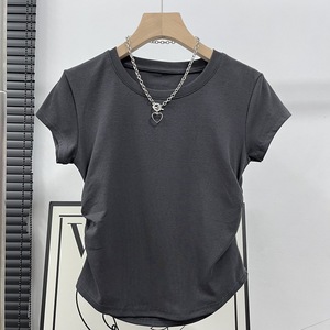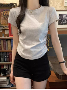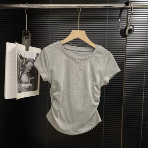 夏季2025正肩T恤女收腰褶皱短袖不规则甜辣显瘦小个子圆领短上衣