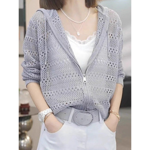 デザインされた中空フード付きジッパー日焼け止めニットブラウス年齢軽減長袖トップ 2025 夏