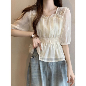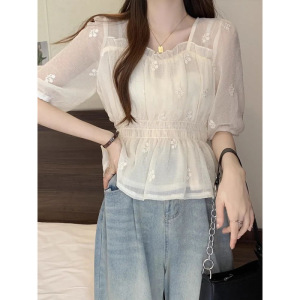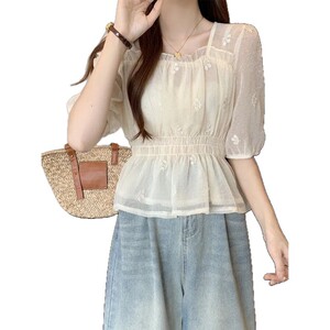 刺繍入り耳付き小香風シフォンシャツ夏ショートフレンチスイートスタイルシャツレディーストップスシフォン半袖