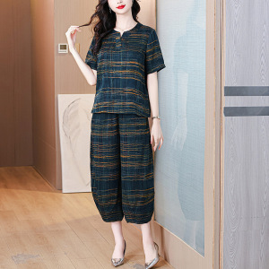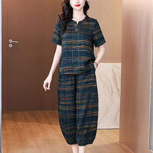 高品質の大きいサイズのお腹カバーと年齢軽減の夏の新しいレトロな気質のハーレムパンツ、ゆったりとしたウエスタンスタイルのトップスのツーピーススーツ