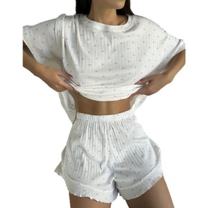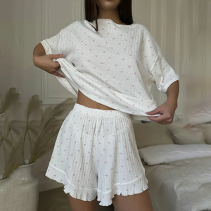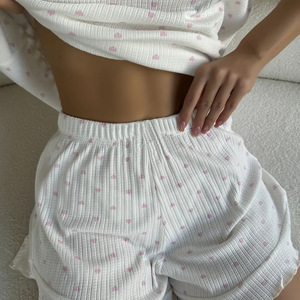 欧美新款春夏休闲女士居家印花短袖花边短裤舒适睡衣可外穿套装