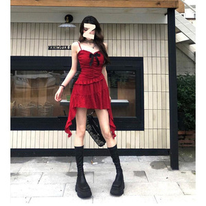 ウエスト痩身不規則フレンチレトロレッドサスペンダードレスレディース薄手日焼け止めカーディガン2点セット