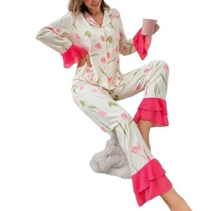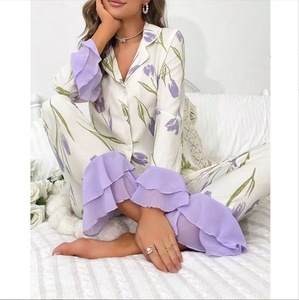 新しいラペル付きパジャマレディースセット、快適で通気性があり、ヨーロッパとアメリカンスタイルのスプライスレース、甘くてカラフルなホームウェア