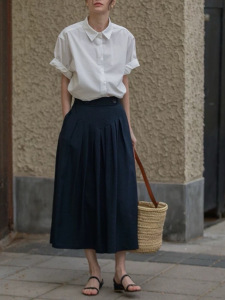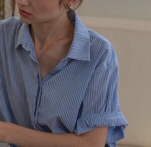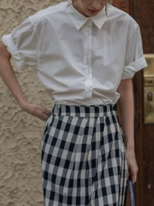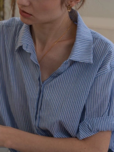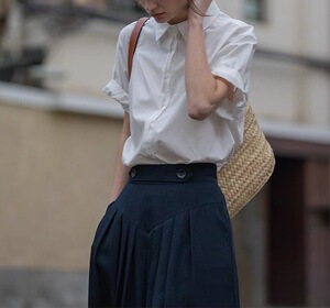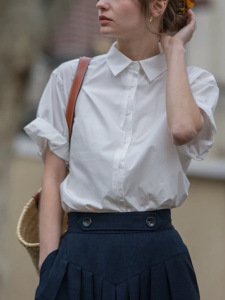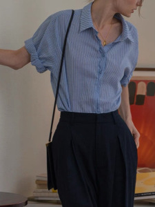Dailyart フレンチレトロカジュアル青と白のストライプトップ気質半袖レイジーラーペルカラーシャツ