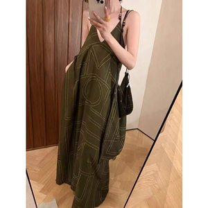 25 夏フレンチリゾートスタイルホルターネック V ネックサスペンダードレス幾何学プリントリラックス痩身ロングスカート 25391