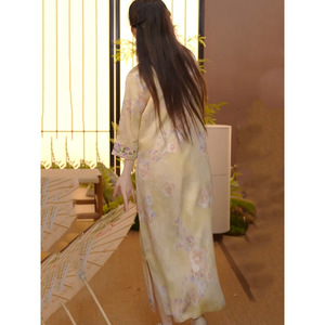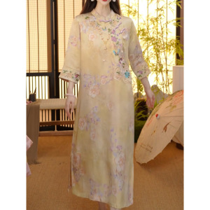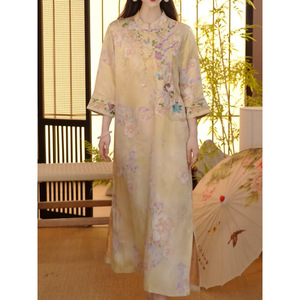 ニッチ文学風バックルスタンドカラーナショナルスタイルドレスサマーニューライトラグジュアリープリント七分袖Aラインスカート8154