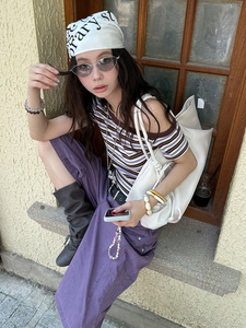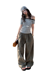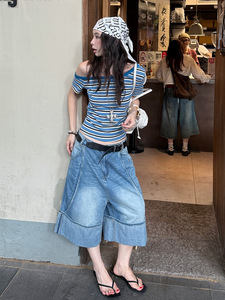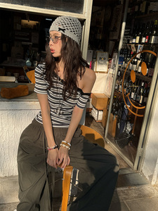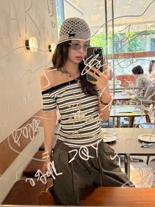 MMFISH おしゃれなコントラストストライプ斜め肩デザイン高弾性痩身シャツ半袖Tシャツ25T295