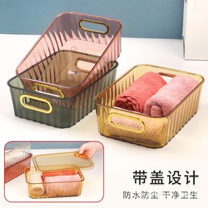 デスクトップ収納ボックス大型化粧品雑貨収納バスケット赤透明積み重ね可能な小さな金色の蓋付きボックス