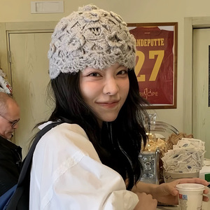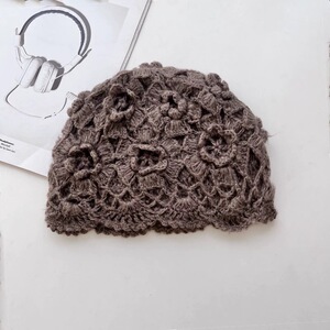 25ss 韓国秋冬手織り立体花ニット帽子レトロかぎ針編みつば帽子モヘアつば帽子