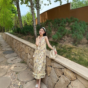 FB 雰囲気バロックローズリネン混 V ネックノースリーブドレス 2025 夏の新しい休暇ロングドレス