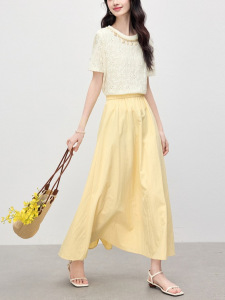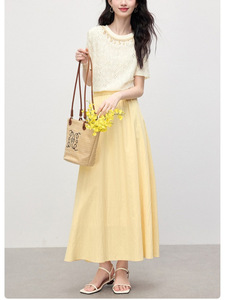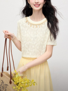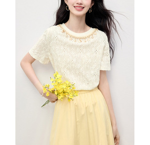 甘いスタイル年齢軽減ヘビーデューティ中空刺繍ビーズラウンドネック Tシャツトップ女性の半袖 2025 夏の新スタイル