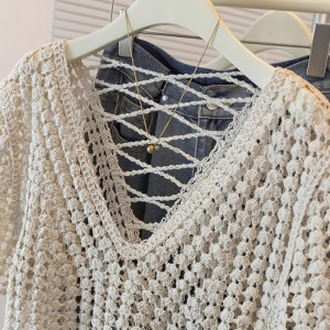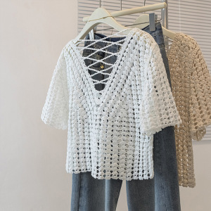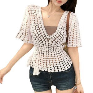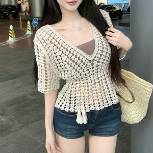 綿かぎ針編み中空プルオーバーブラウス女性の夏のショートトップ 2025 新しいルーズ半袖レースシャツ 6091