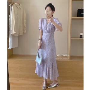 ライトパープルの夢のような美しい青と紫の花柄ドレス夏の新しい気質痩身ウエストドレス女性用