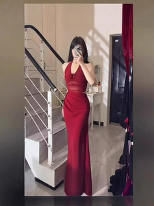 Pure Desire ハイエンドメッシュスプライシングホルターネックドレス 2025 夏の新ウエストファッショナブルな気質ロングスカート女性のための