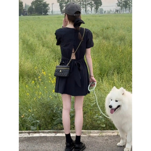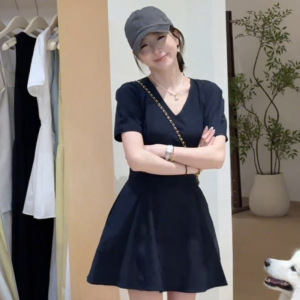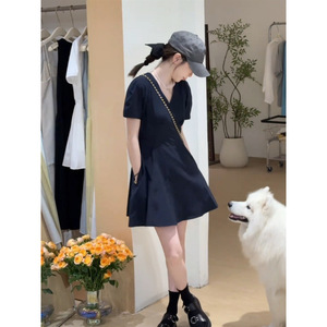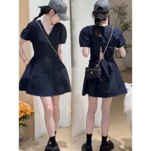 WEWE フレンチ優しい気質 V ネック半袖ドレス女性の夏の小柄なストラップウエストバックレス A ラインスカートトレンディ