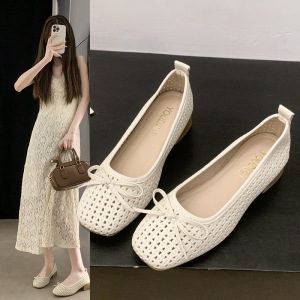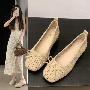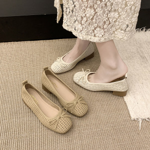 2025 夏の新スタイル中空フレンチリボンスクエアトゥシューズ女性のローヒールビーニーシューズ厚いヒールメリージェーン