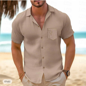 跨境亚马逊男式夏季复古竹节麻宽松亨利休闲沙滩衬衫简约风透气