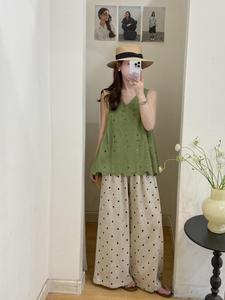 夏の新しい韓国スタイルのシンプルな中空 V ネック無地ノースリーブベストトップハイウエスト水玉ワイドレッグパンツスーツ女性のための