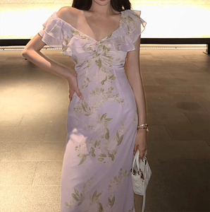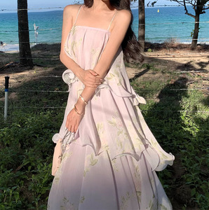 デンマーク人デザイナーがプリントした軽い高級感と高級感のあるヘビーデューティーフィッシュボーン刺繍サスペンダースカート花柄ドレス