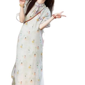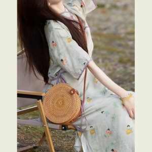 新しい中国風の綿とリネンのプリントドレス 2025 夏の女性のための見栄えの良いニッチなスタイルの中国風のボタン付きスカート