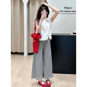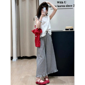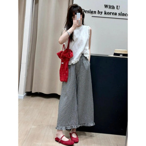 2025超火夏装小个子独特漂亮白色木耳边无袖衬衫格子阔腿裤套装女