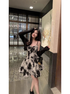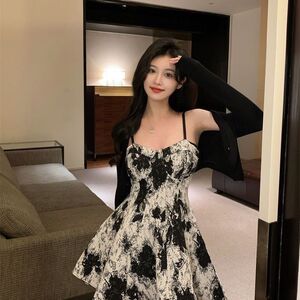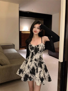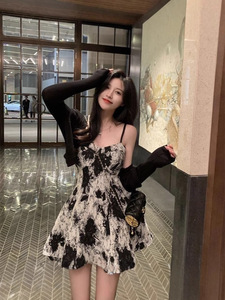 纯欲风水墨吊带连衣裙套装女辣妹防晒薄款开衫外套显瘦水墨短裙子
