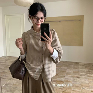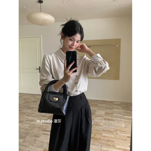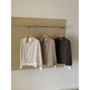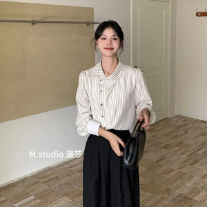 デザインニッチな斜めボタンラペルカラーストライプシャツレディース秋冬フレンチスタイル多用途ユニークでシックなトップス
