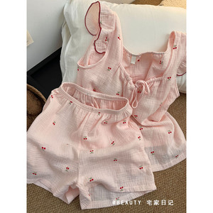 甘くてかわいいチェリープリントの柔らかいワックス状綿ガーゼパジャマ女性のための夏 2025 新しいサスペンダーショーツスーツホームウェア